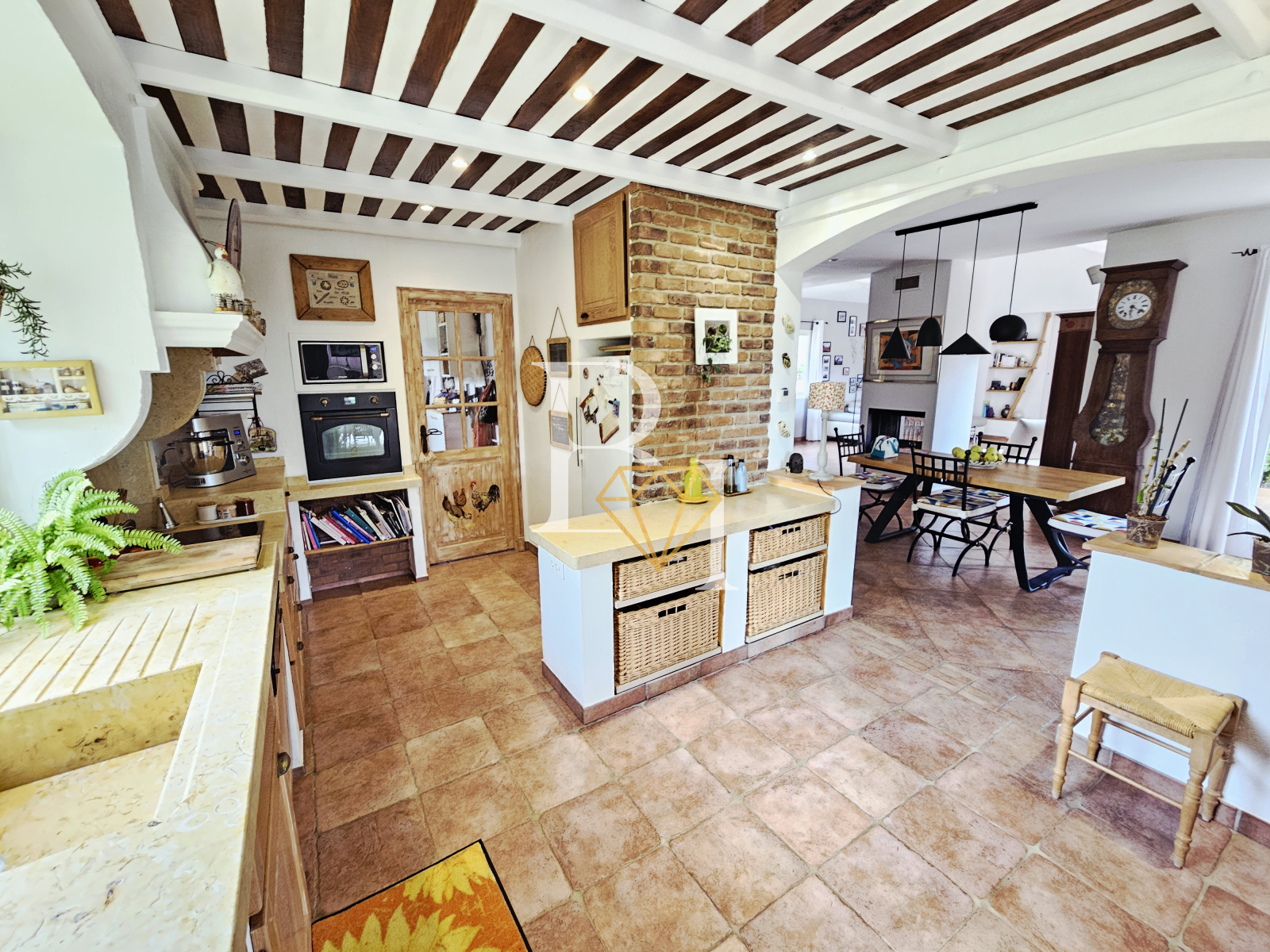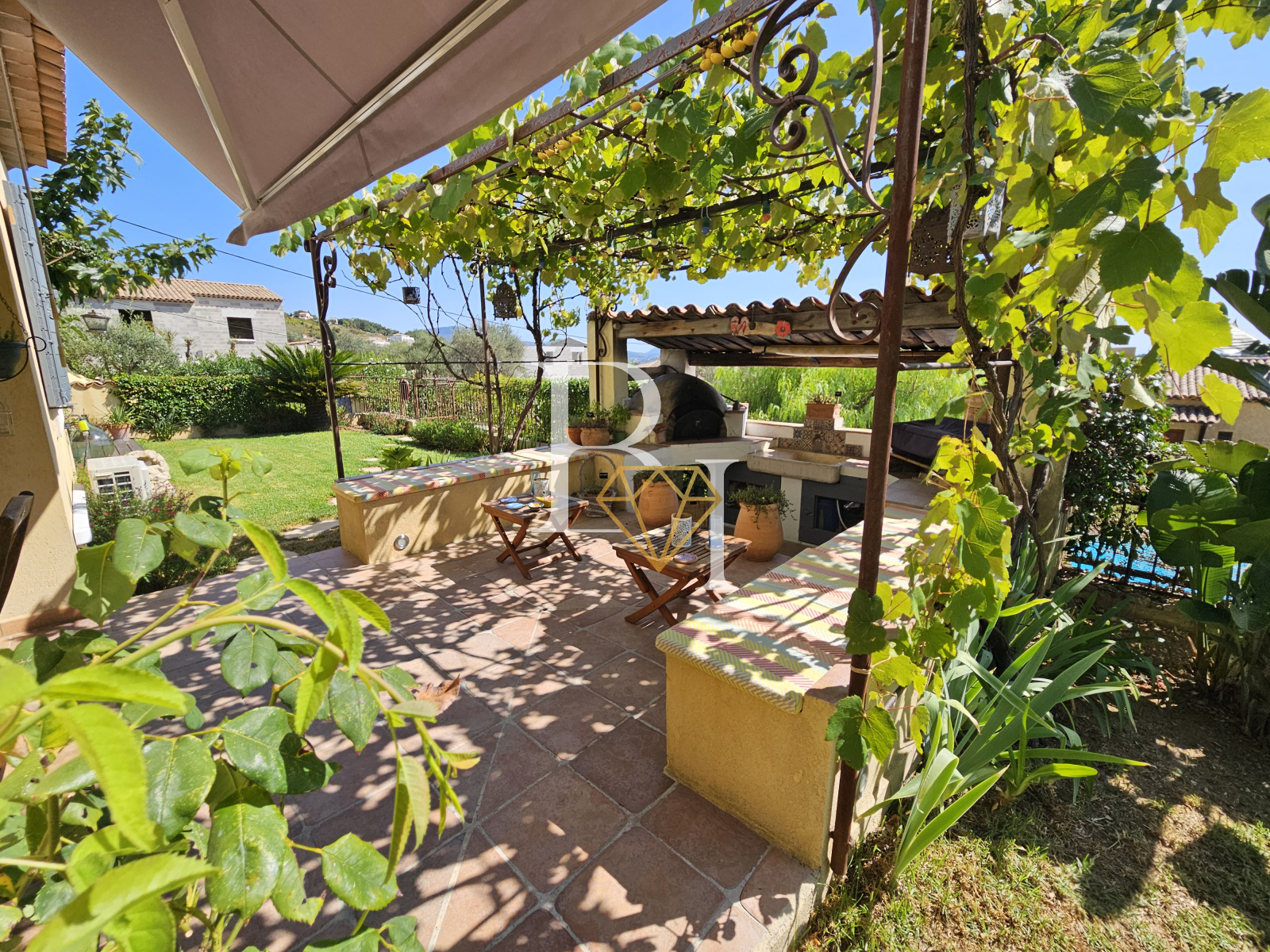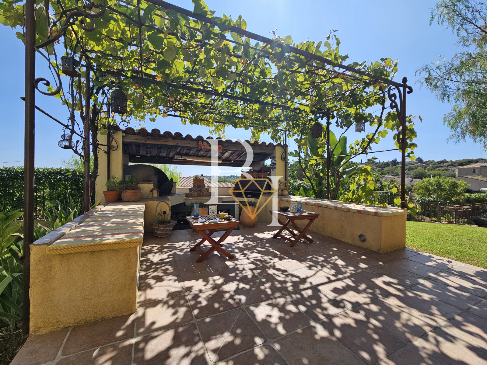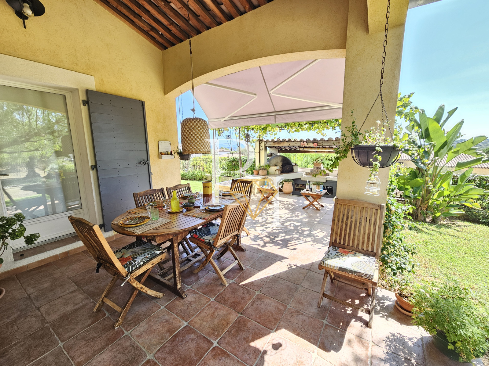 La cuisine s’ouvre sur une grande terrasse couverte orientée sud, prolongée par une cuisine d’été avec four à pizza. Le séjour donne quant à lui sur un patio en bois exotique, également orienté sud.