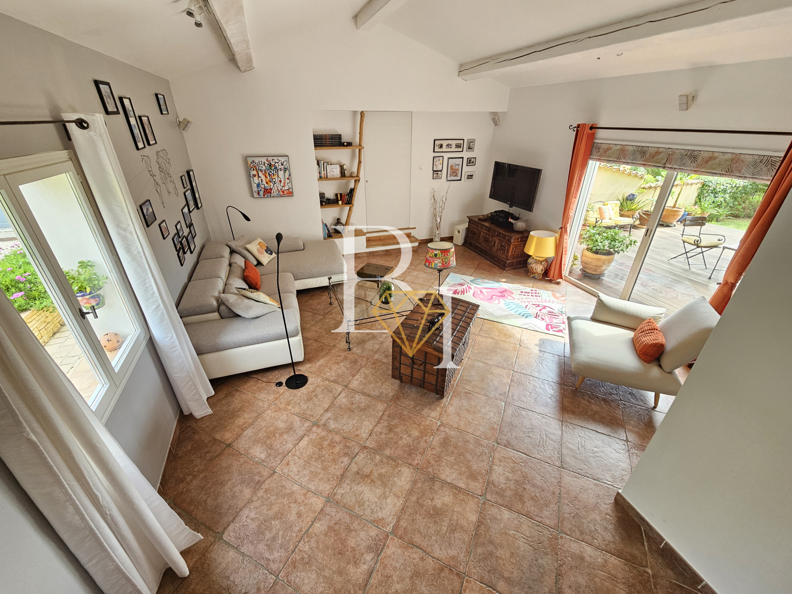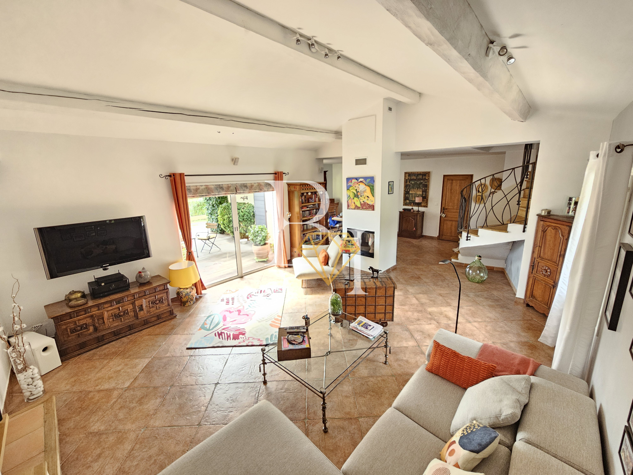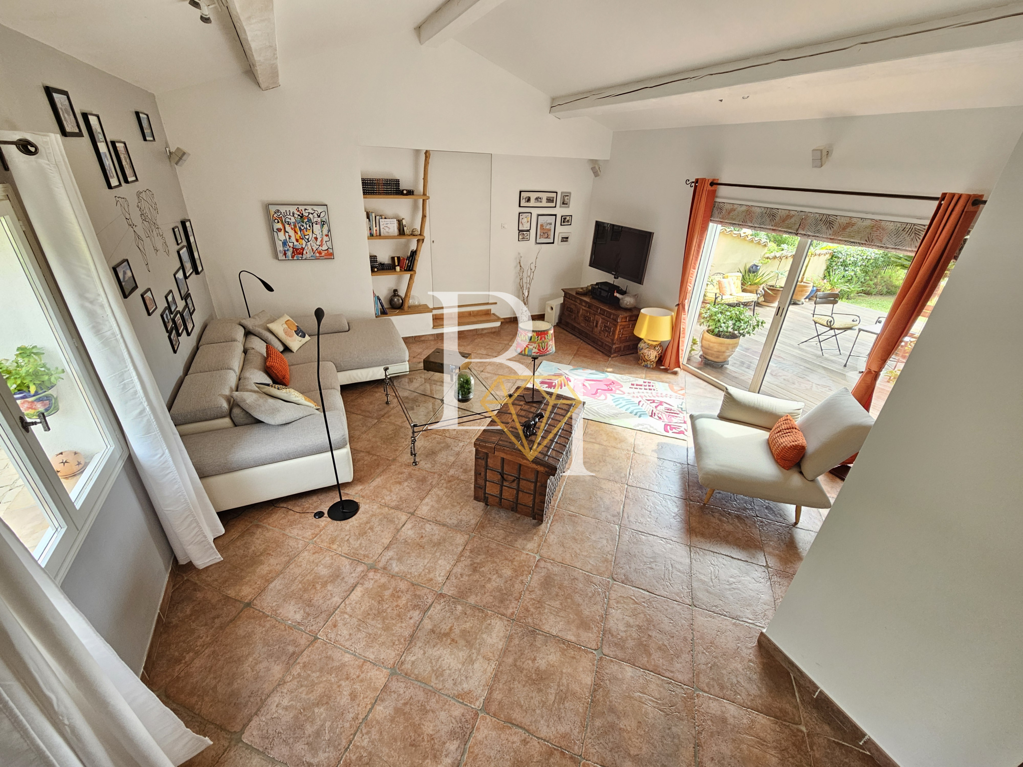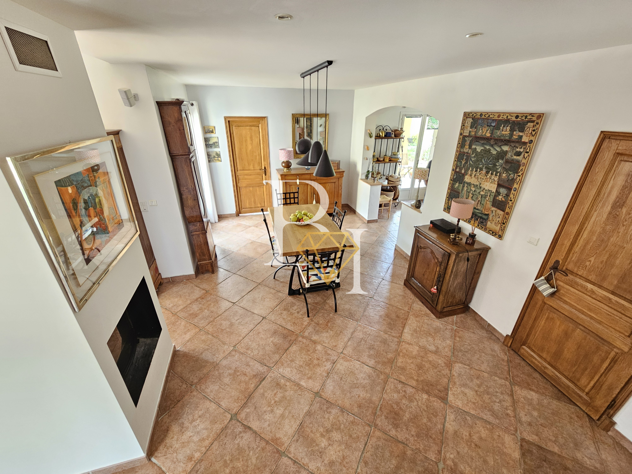 La cuisine s’ouvre sur une grande terrasse couverte orientée sud, prolongée par une cuisine d’été avec four à pizza. Le séjour donne quant à lui sur un patio en bois exotique, également orienté sud.