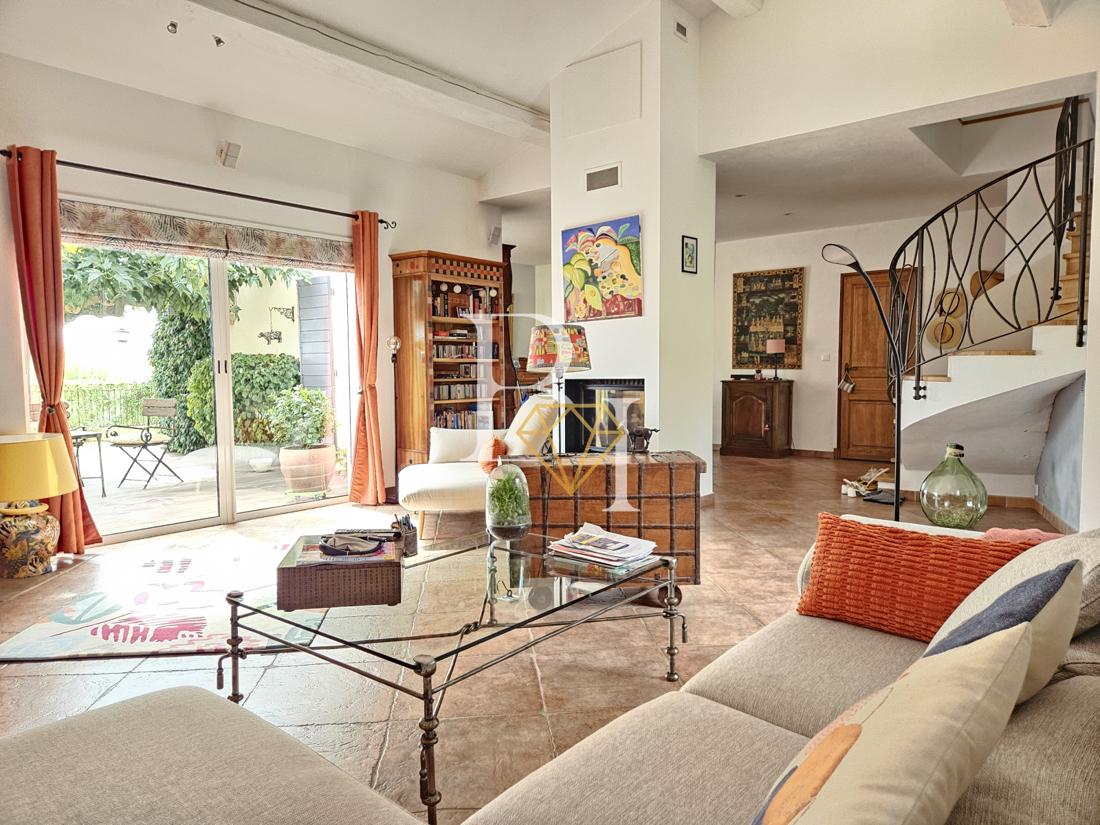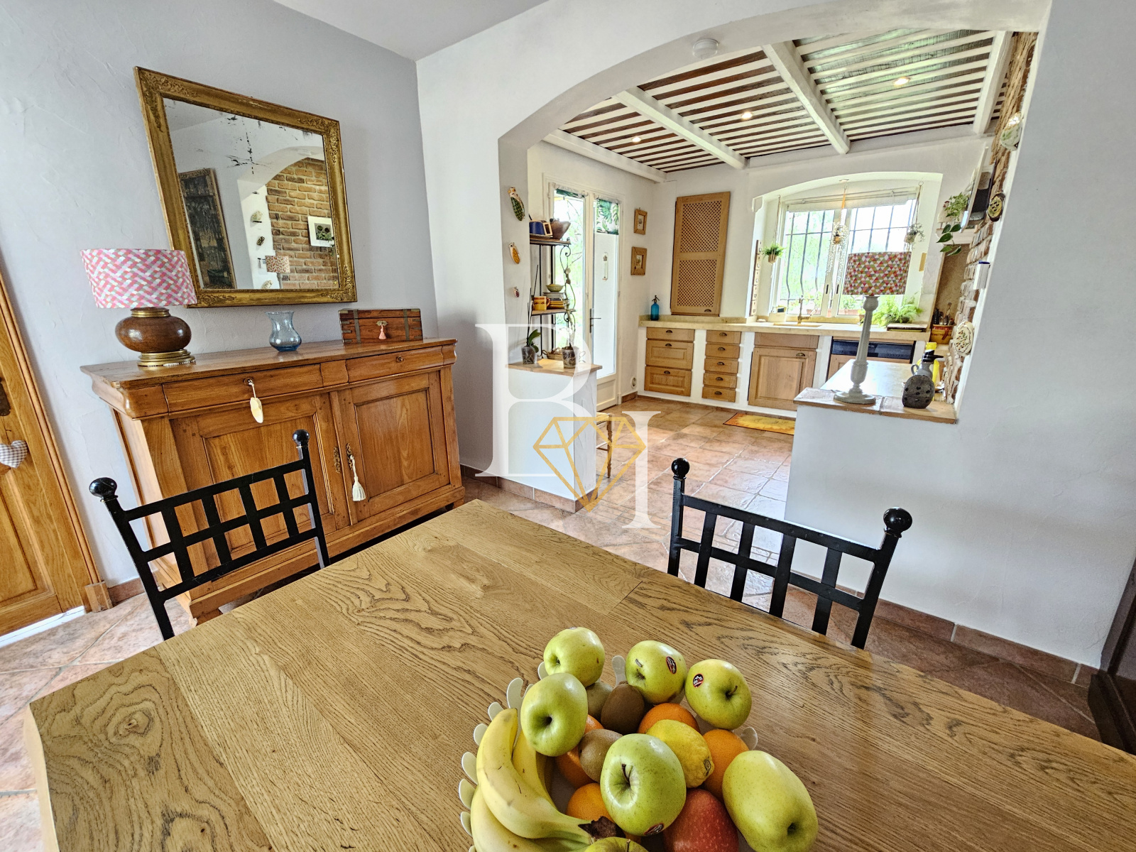 La maison principale, de style provençal, offre 131 m² habitables répartis sur deux niveaux. Au rez-de-chaussée, elle se compose d’une entrée avec salle d’eau et WC, d’une chambre, d’un salon cathédrale avec cheminée à insert et coin salle à manger, ainsi que d’une cuisine entièrement équipée prolongée par un cellier.
